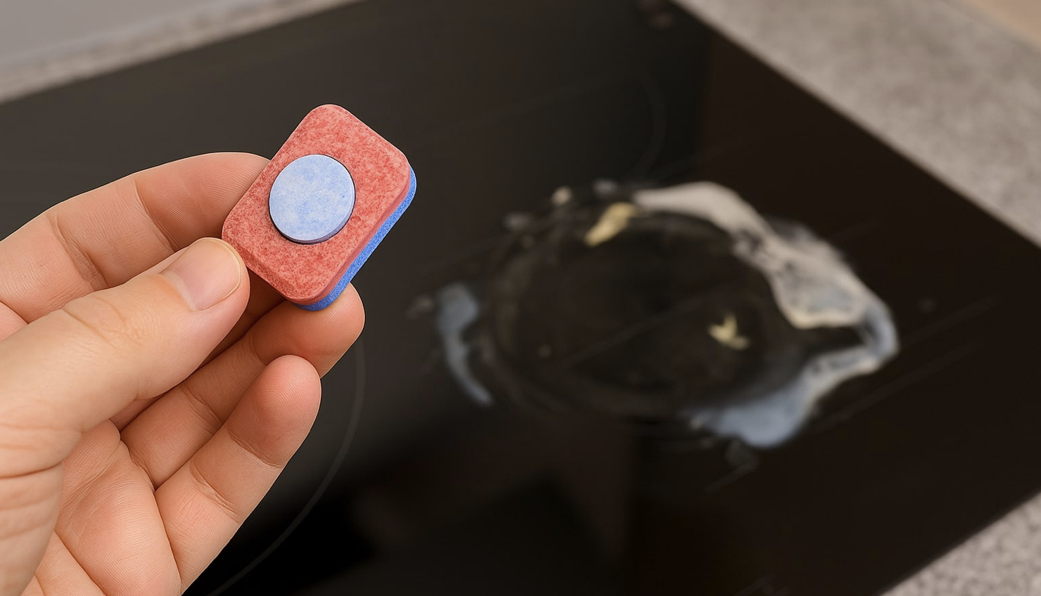 많은 분들이 눌어붙은 자국을 빨리 없애려고 긁거나 세게 문지르거나, 강한 화학 세제를 사용해요. 하지만 이런 방법은 표면을 상하게 하거나 때를 더 퍼뜨리기만 하고, 기대만큼 효과가 없는 경우가 많아요. 아무리 강한 세정제라도 끓어 넘치면서 생긴 딱딱한 찌꺼기를 부드럽게 만들지는 못하는 경우가 많거든요. 식기세척기 세제는 작용 방식이 달라요. 자극적인 화학 성분 대신, 효소와 기름때 제거 성분이 천천히 풀리면서 찌꺼기를 분해해 줘요. 단, 반드시 먼저 물에 녹여야 해요. 세제를 그대로 가스레인지에 문지르면 효과도 거의 없고 표면에 흠집이 생길 수 있어요.