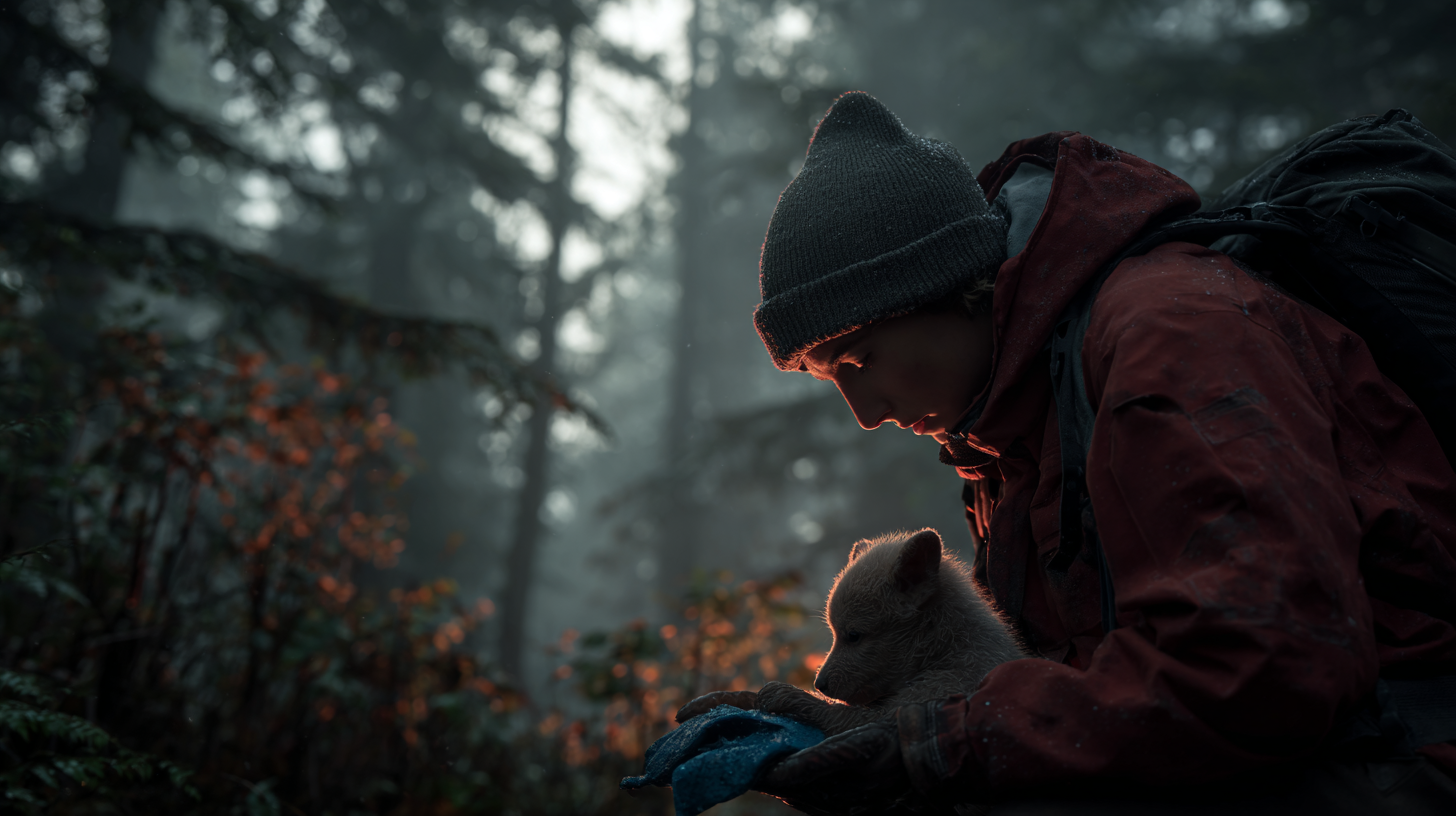 그는 떨리는 손으로 젖은 천을 풀었다. 그 안에는 팔뚝만 한 작은 강아지가 있었다. 온몸이 진흙과 빗물로 뒤덮여 있었고, 약하게 낑낑거렸다. 추위에 몸이 덜덜 떨리고 있었다. 라이언은 믿기지 않아 멍하니 바라봤다. 곰이 이 연약한 생명을 자신에게 데려온 것이다. 왜? 그는 급히 자신의 재킷을 벗어 강아지를 감싸 안았다. 가슴에 꼭 안으니 작은 심장이 약하지만 분명하게 뛰고 있었다. “이제 괜찮아.” 그가 속삭였다. 안도와 놀라움이 뒤섞인 목소리였다. 다시 숲을 올려다봤지만, 곰은 이미 안개 속으로 사라지고 없었다.