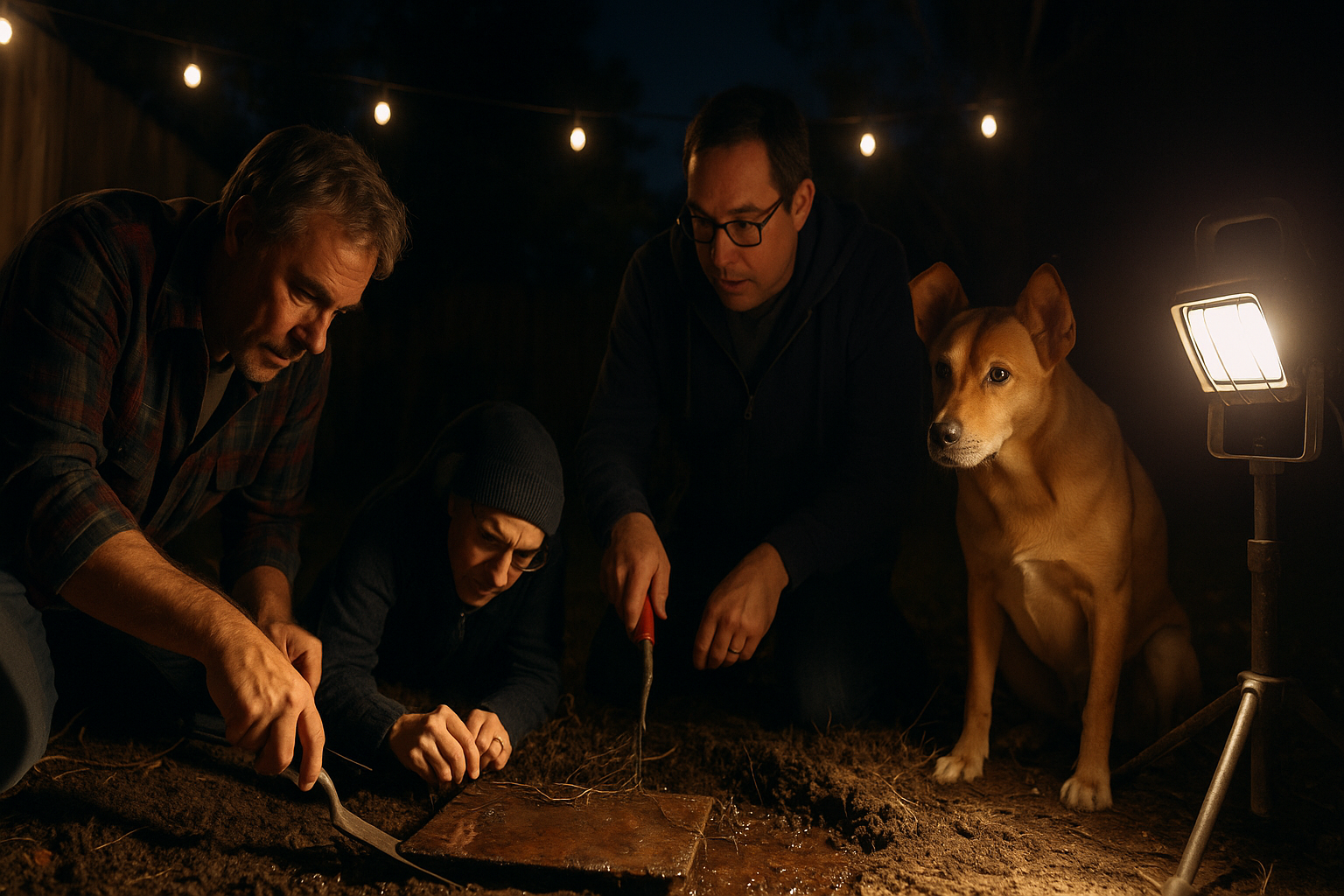 월터는 삽과 쇠지렛대를 가져왔습니다. 둘은 뿌리를 조심스레 걷어내며 흙을 파냈습니다. 점점 드러난 금속 조각은 결국 네모난 철판, 단단히 볼트로 고정된 뚜껑이었습니다. 누군가 일부러 묻은 것이 분명했죠. 개는 진흙을 핥으며 재촉하듯 낑낑거렸습니다. 그 자리를 떠날 생각이 없었죠.