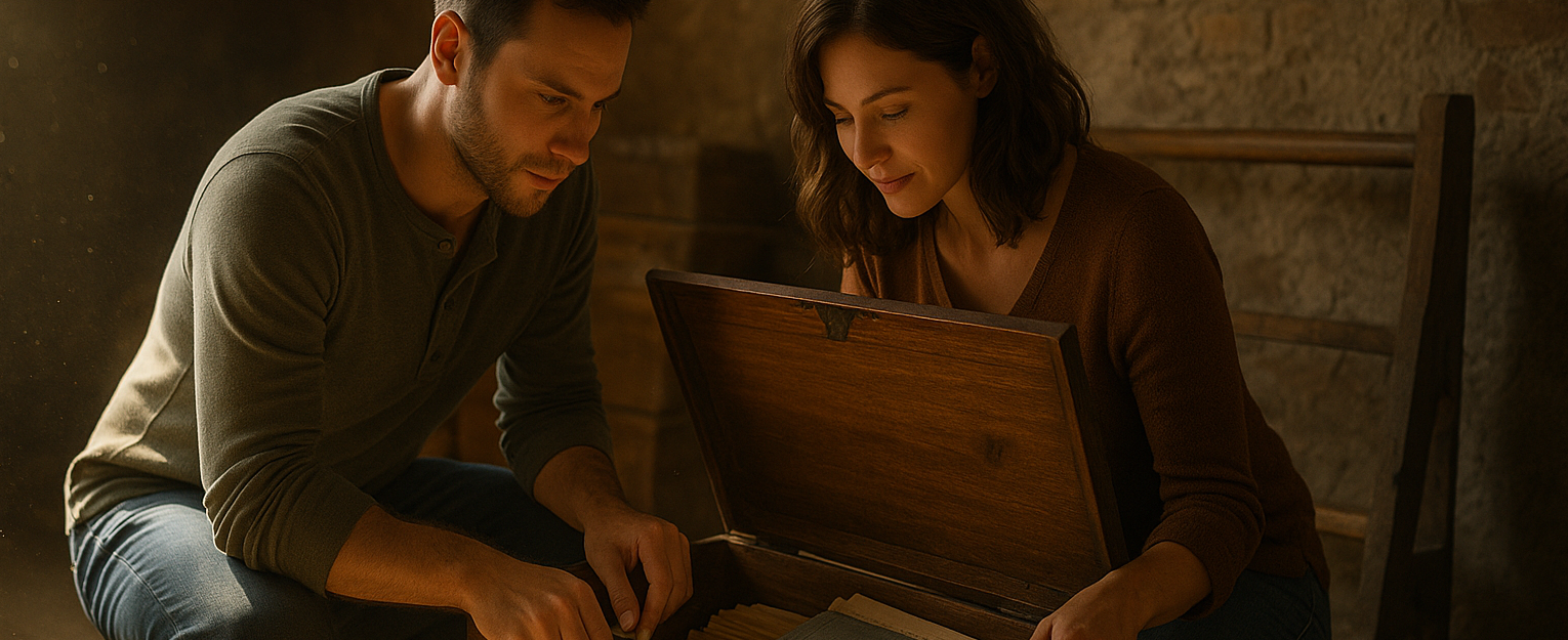 해 질 무렵, 두 사람은 종탑을 올랐습니다. 계단을 오를 때마다 발자국이 메아리쳤습니다. 두 번째 층참에서 한 장의 돌판이 살짝 흔들렸고, 조심스레 들어 올리자 바랜 리본으로 묶인 작은 깡통 상자가 나왔습니다. 종소리가 울려 퍼졌고, 시간마저 멈춘 듯 고요한 순간이 찾아왔습니다.