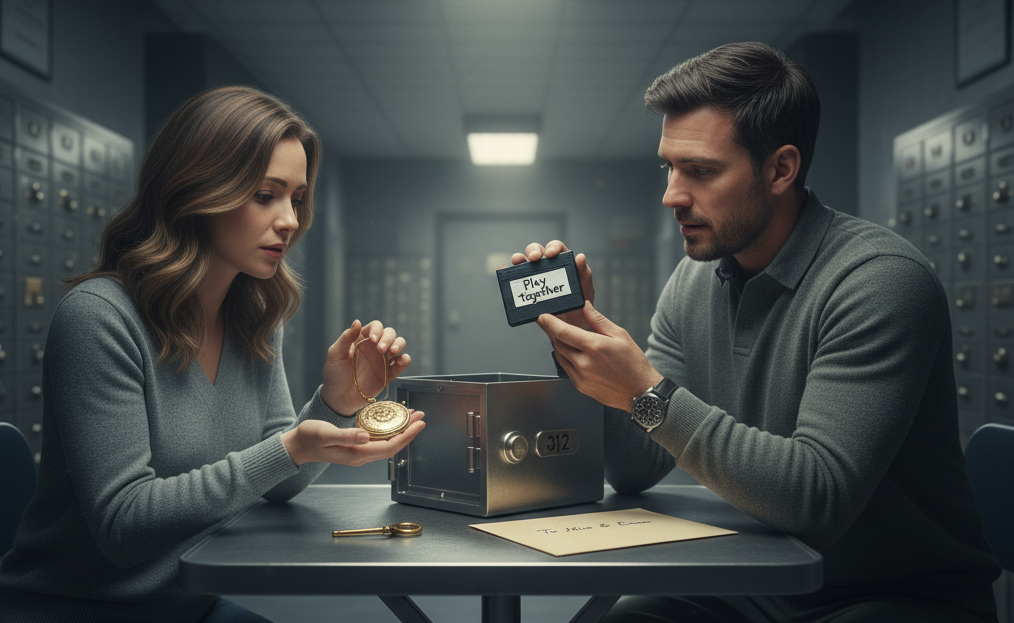 다음 날, 은행 금고 안의 보관함 312가 열렸습니다. 안에는 ‘함께 재생하세요’라고 적힌 테이프와, 두 사람의 이름이 적힌 봉인된 편지, 그리고 묵직한 로켓 목걸이 하나가 들어 있었습니다.
